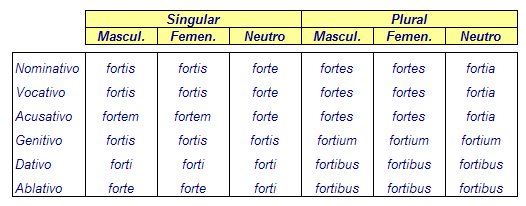 A este grupo pertenecen adjetivos como fortis, forte (fuerte), gravis, grave (serio).