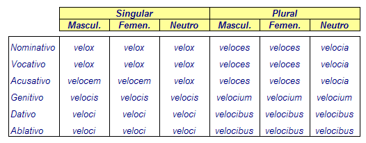 Existen algunos adjetivos que tienen solamente una terminación. A este grupo pertenecen velox (rápido) y felix (feliz).